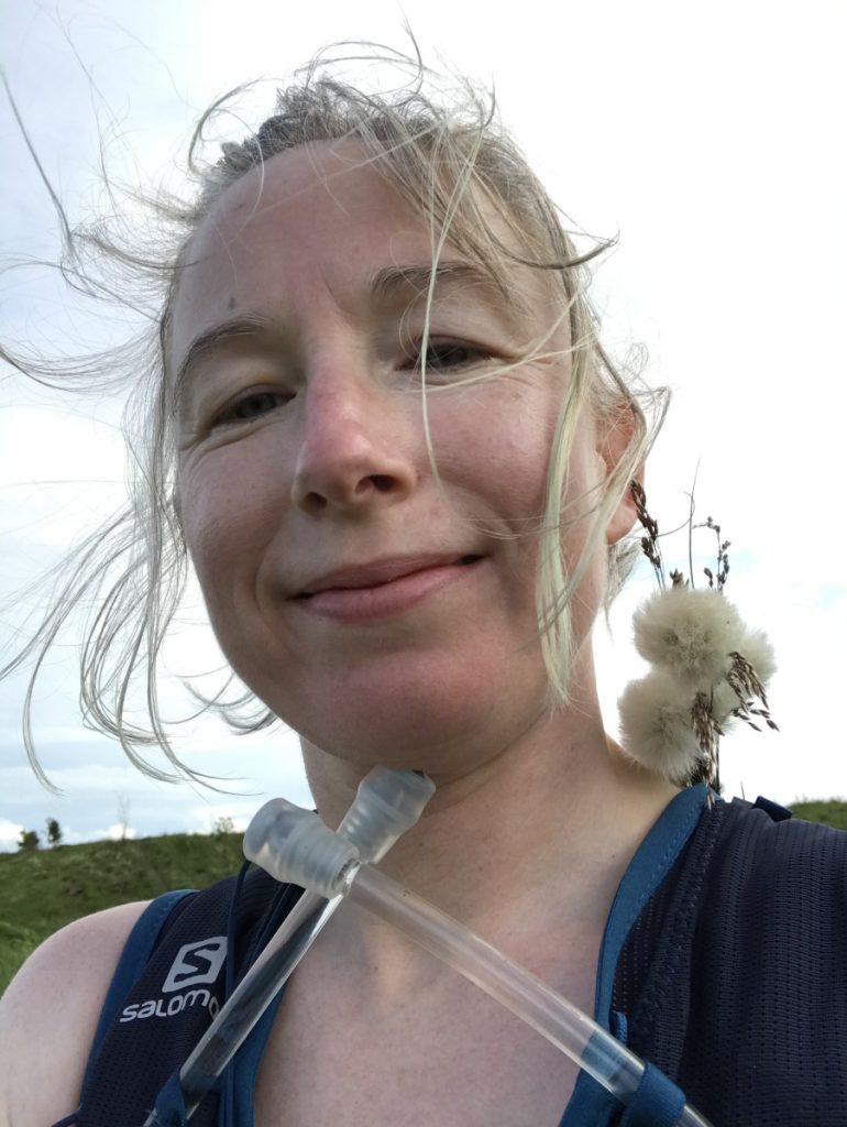 Image 2: Head and shoulders shot of smiling female runner with wind in her tied-back blonde hair. She is wearing a running vest with water straws visible at the front, and she is carrying a posy of bog cotton in her backpack.