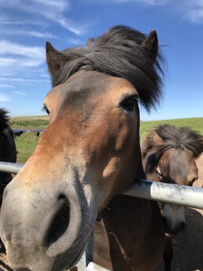 Image 1: Close-up of the face of an Exmoor pony, located outside on a clear day with a blue sky in a green field, amongst others in the herd. Its mane is blowing in the wind, and the sun is shining on the smoky brown, red-brown, grey and black tones of the pony’s coat.